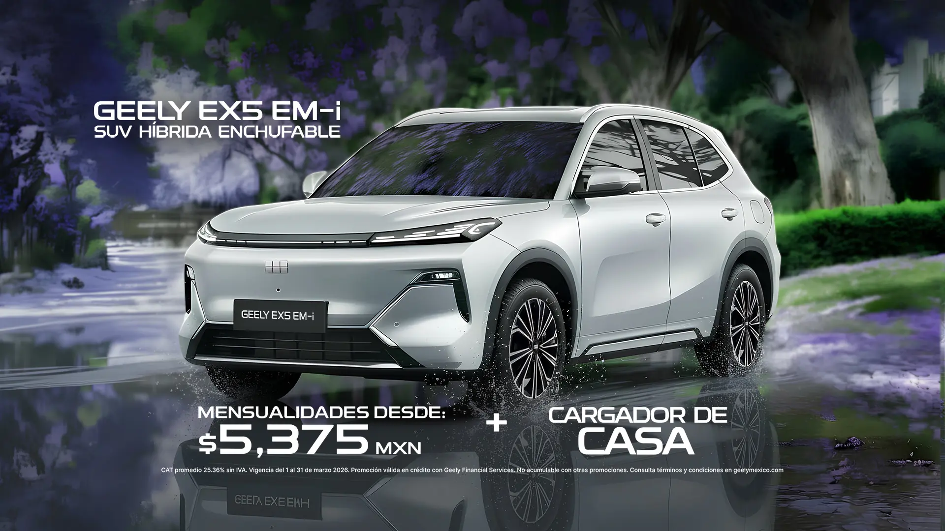 La mensualidad desde $5,375.00 MXN aplica únicamente con el plan de crédito simple, a través de Geely Financial Services (BBVA México S.A., Institución de Banca Múltiple), para el modelo EX5 EM-i 2026 en su versión GL, con un enganche desde 50.05 %, sobre un importe promedio a financiar de $264,995 MXN a un plazo promedio de 72 meses y tasa de interés ordinaria fija anual sin IVA del 10.49% con plan Sostenible. Esta oferta no incluye el costo del seguro, mismo que podrá ser cubierto de contado o financiado, conforme a lo estipulado en su contrato, y no es acumulable con otras promociones. Monto de la mensualidad publicada incluye IVA e impuestos. Aplica 2.5% de comisión por apertura en plan SOSTENIBLE.
