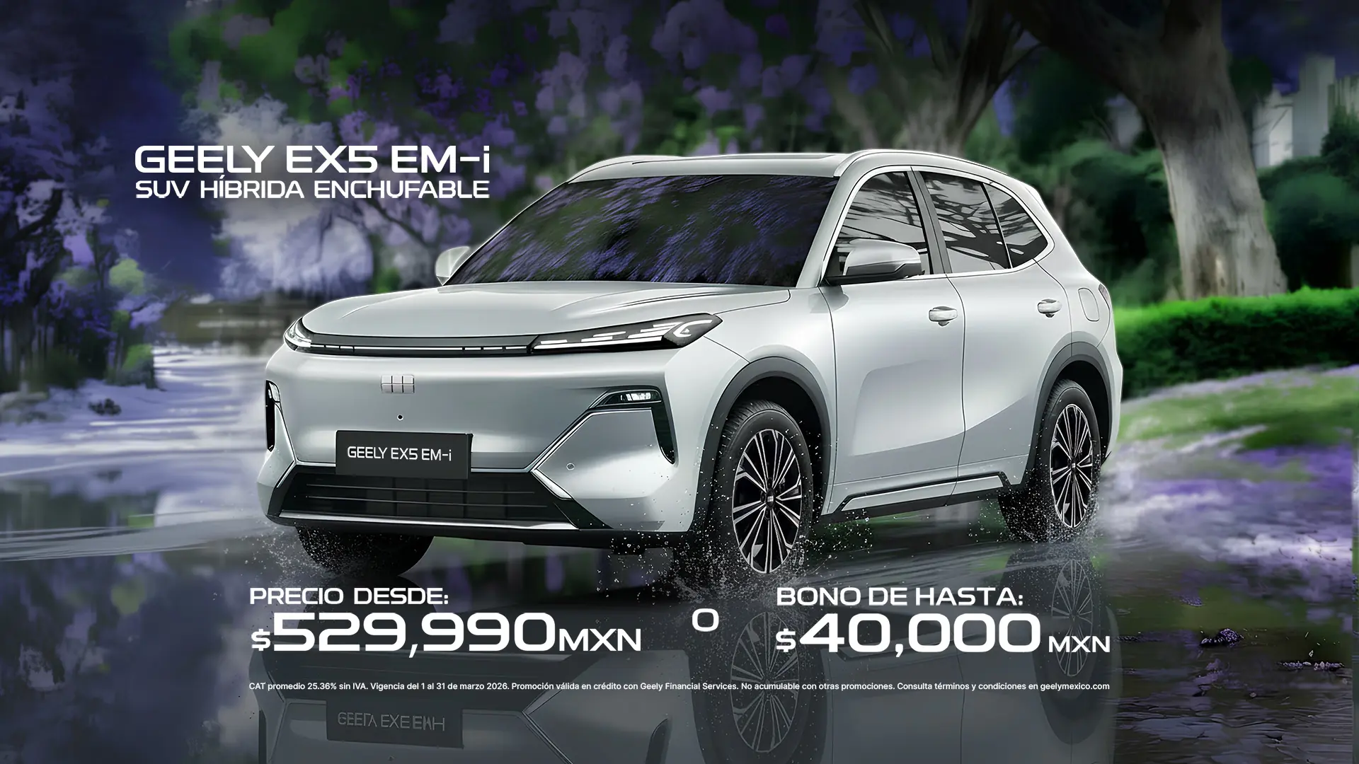 Imágenes de referencia. Esta oferta es válida en toda la República Mexicana, durante el periodo comprendido del 01 de marzo al 31 de marzo de 2026 o hasta agotar existencias. No aplica con otras promociones ni en la compra de flotillas. Para conocer planes y modalidades de crédito, verificar precios, requisitos de contratación, comisiones, disponibilidad, términos y condiciones consulta a tu Distribuidor Autorizado Geely®.