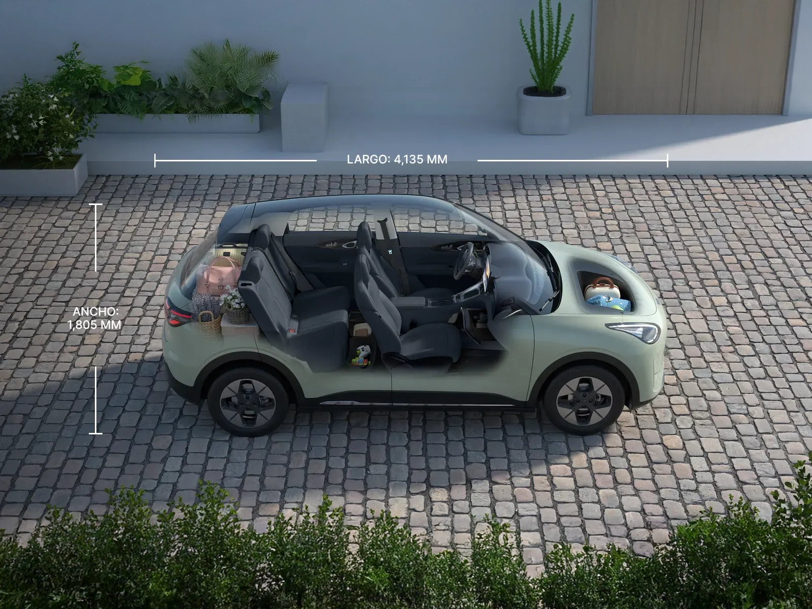 Proporciones equilibradas de 4,135 mm de largo que facilitan maniobras urbanas sin sacrificar presencia y espacio interior.
